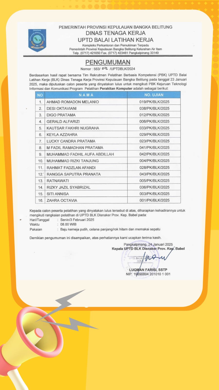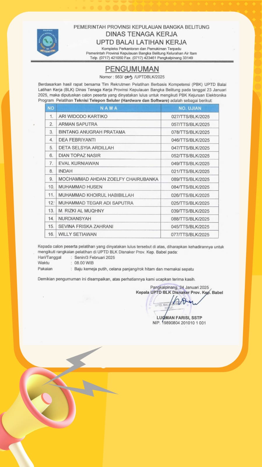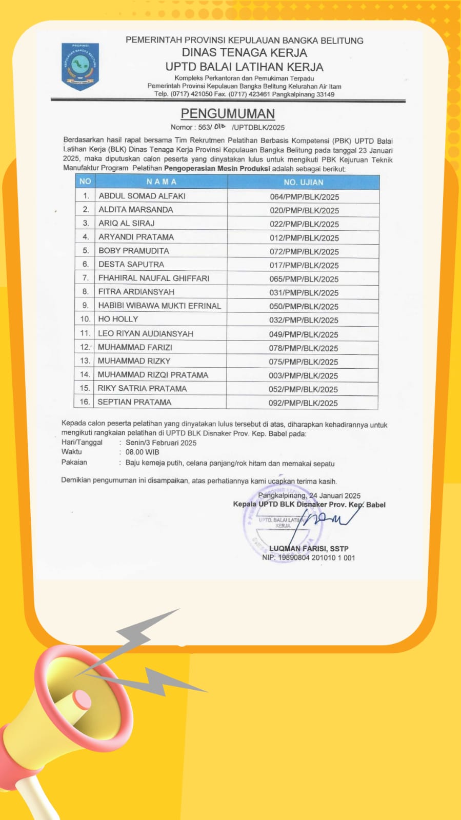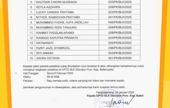Daftar nama sejumlah peserta  Lulus dan dapat mengikuti Pelatihan yang diselenggarakan oleh BLK/Balai Latihan Kerja Pemerintah Provinsi (tertera pada daftar),masing masing kelas kejuruan terdiri dari 16 personil, berikut dengan Kejuruan: