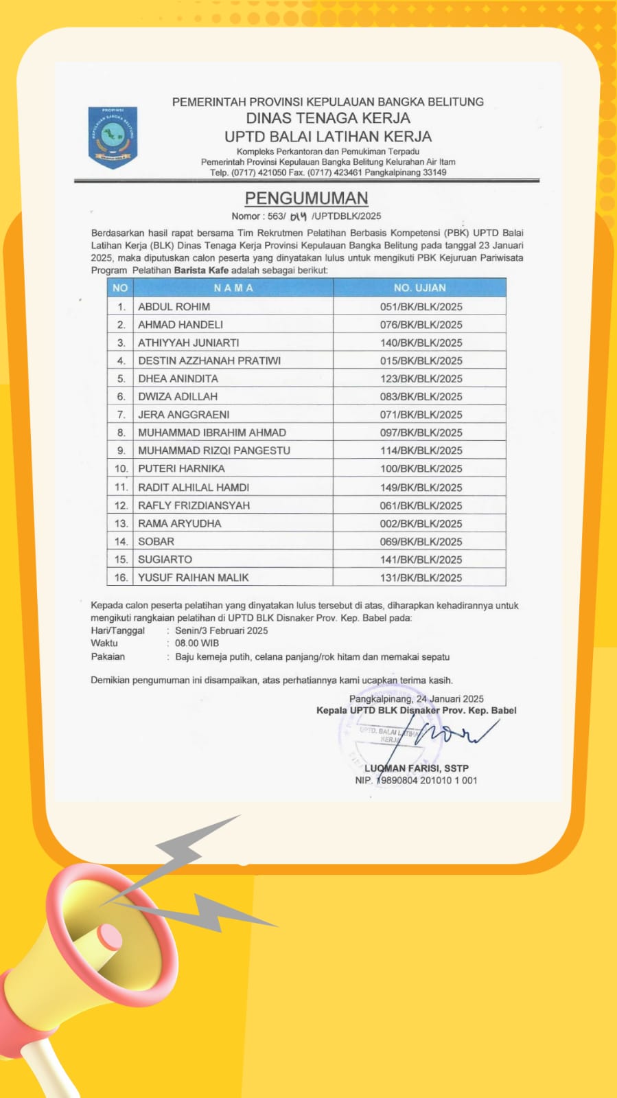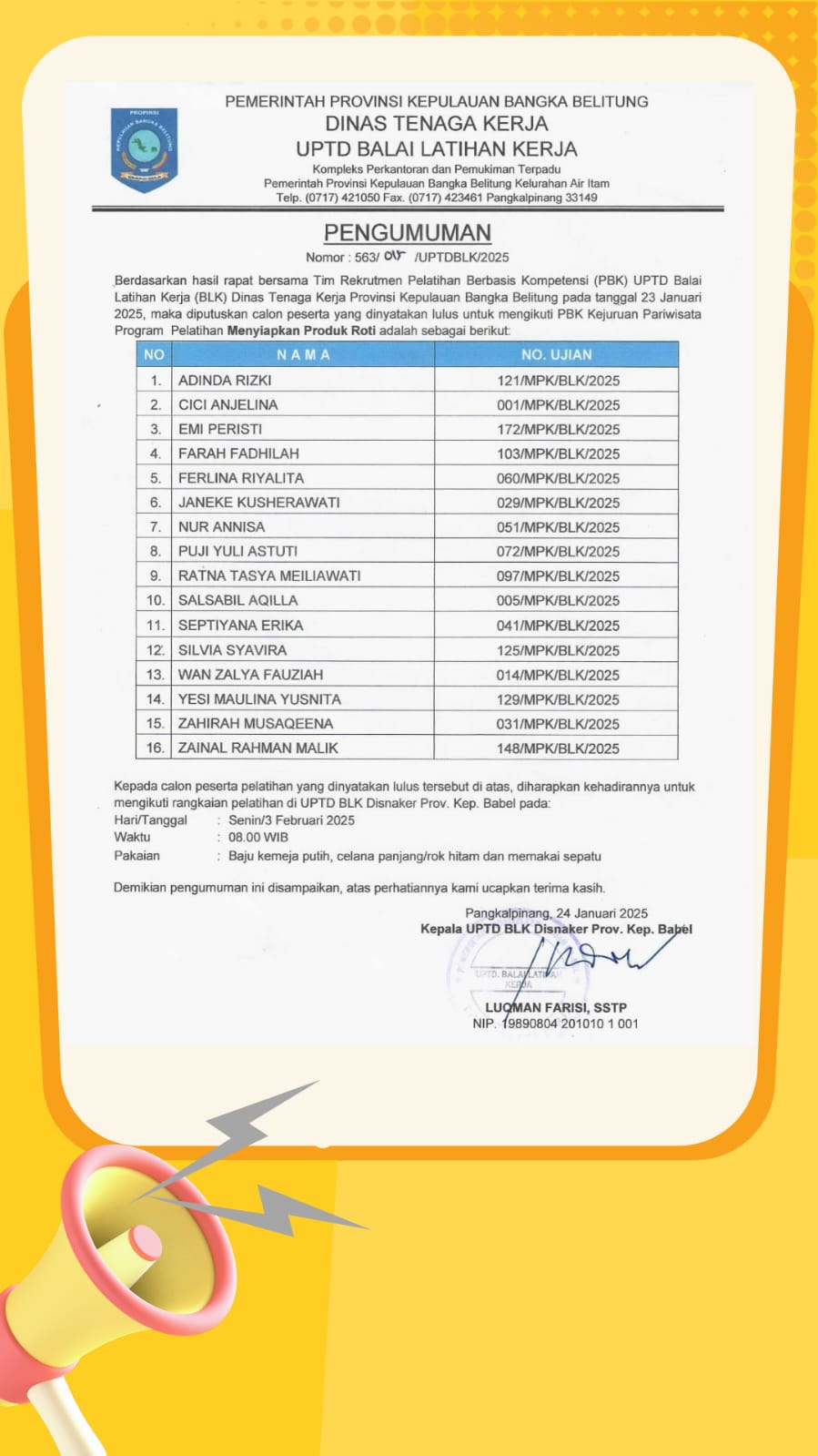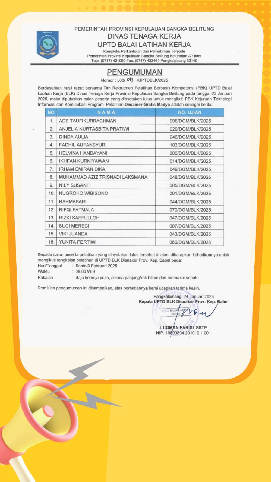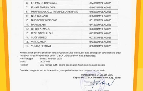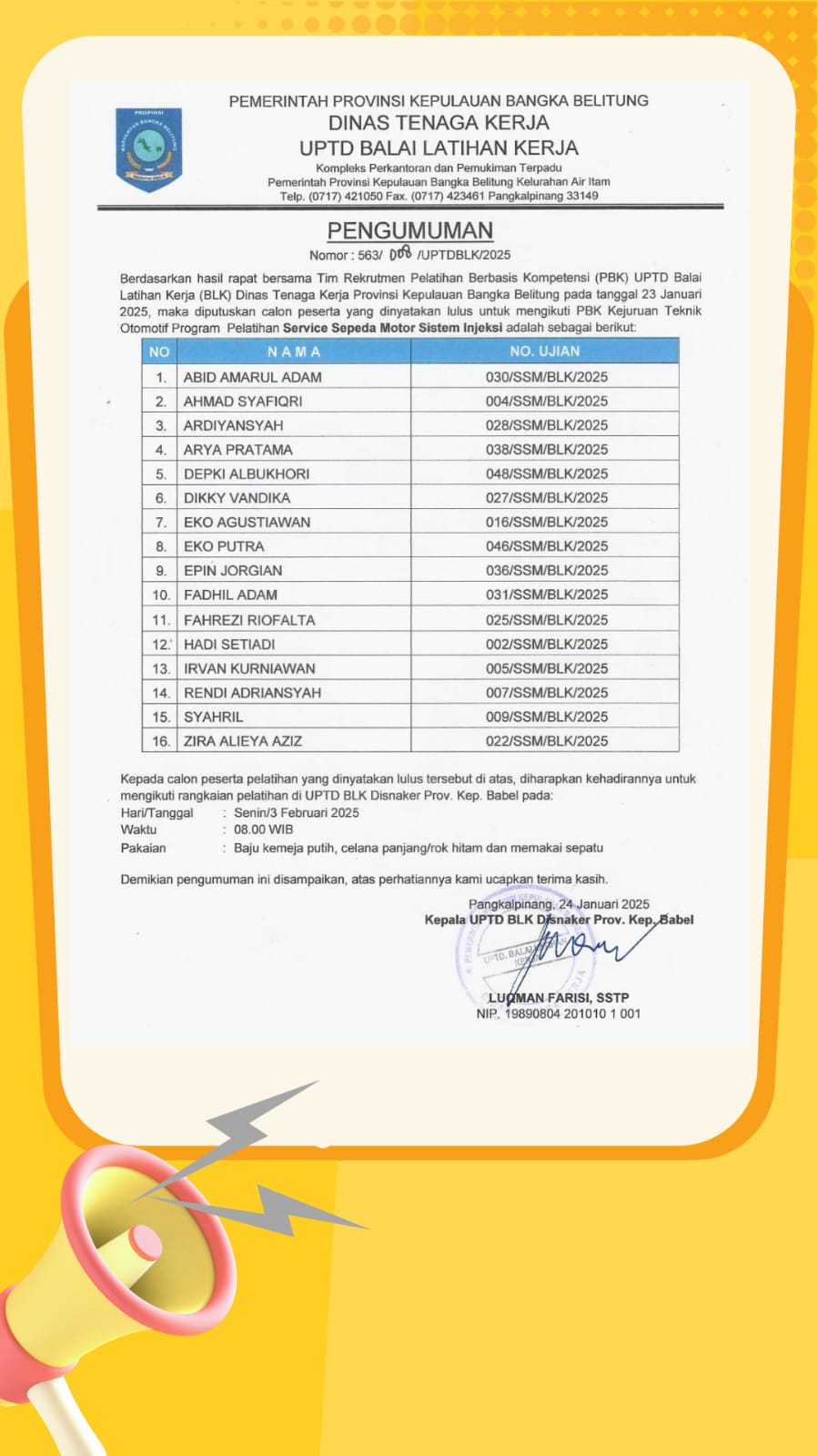 Daftar nama sejumlah peserta  Lulus dan dapat mengikuti Pelatihan yang diselenggarakan oleh BLK/Balai Latihan Kerja Pemerintah Provinsi (tertera pada daftar),masing masing kelas kejuruan terdiri dari 16 personil, berikut dengan Kejuruan: