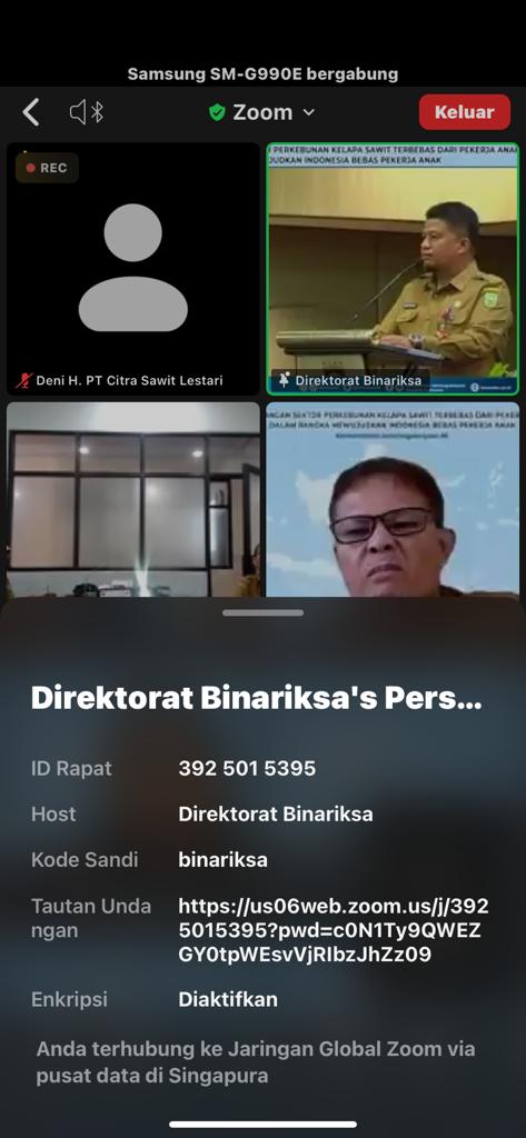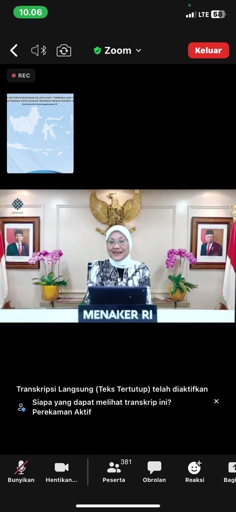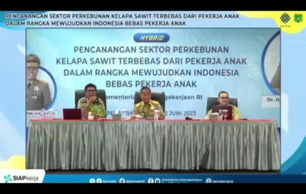 Dalam Rangka Hari Internasional Menentang Pekerja Anak/World Day Against Child Labour, Kemnaker RI menyelenggarakn Zoom Meeting dengan tema: Pencanangan Sektor Perkebunan Kelapa Sawit Terbebas dari Pekerja Anak dalam Rangka Mewujudkan Indonesia Bebas dari Pekerja Anak.Senin,12 Juni 2023.