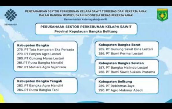 Pada Tahun 2023 jumlah perusahaan mendukung penghapusan pekerja anak terdapat 423 perusahaan se Ndonesia sedangkan di wilayah Babel,perusahaan sektor perkebunan kelapa sawit yang telah berkomitmen tidak mempekerjakan anak tertera pada tabel.