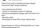 Tribina Group saat ini membuka lowongan sebagai "Recruitment Staff" dengan kualifikasi: - Usia maksimal usia 28 Tahun - Lulusan S1, diutamakan lulusan S1 Psikologi - Mempunyai pengalaman sebagai...