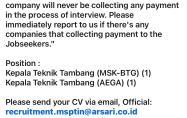 Arsari Tambang membuka kesempatan kerja untuk 2(dua) posisi Kepala Teknik Tambang, penempatan;