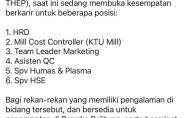 HRD,MiLL Cost Controller/KTU MiLL,Team Leader Marketing,Asisten QC,SPV Humas-Plasma & SPV HSE-PT THEP