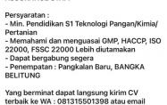 QUALITY CONTROL/QUALITY ASSURANCE STAFF-CV Panen Baru-PangkalanBaru-Bangka Belitung