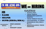 Persyaratan: Pria/wanita, pengalaman minimal 1(satu) tahun, pendidikan minimal SMA/SMK, jujur, disiplin-betanggungjawab,...