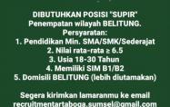pendidikan minimal SMA/SMK/sederajat, nilai rata-rata> 6.5, usia 18-30 tahun, memiliki SIM B1/B2, Domisili Belitung diutamakan.
