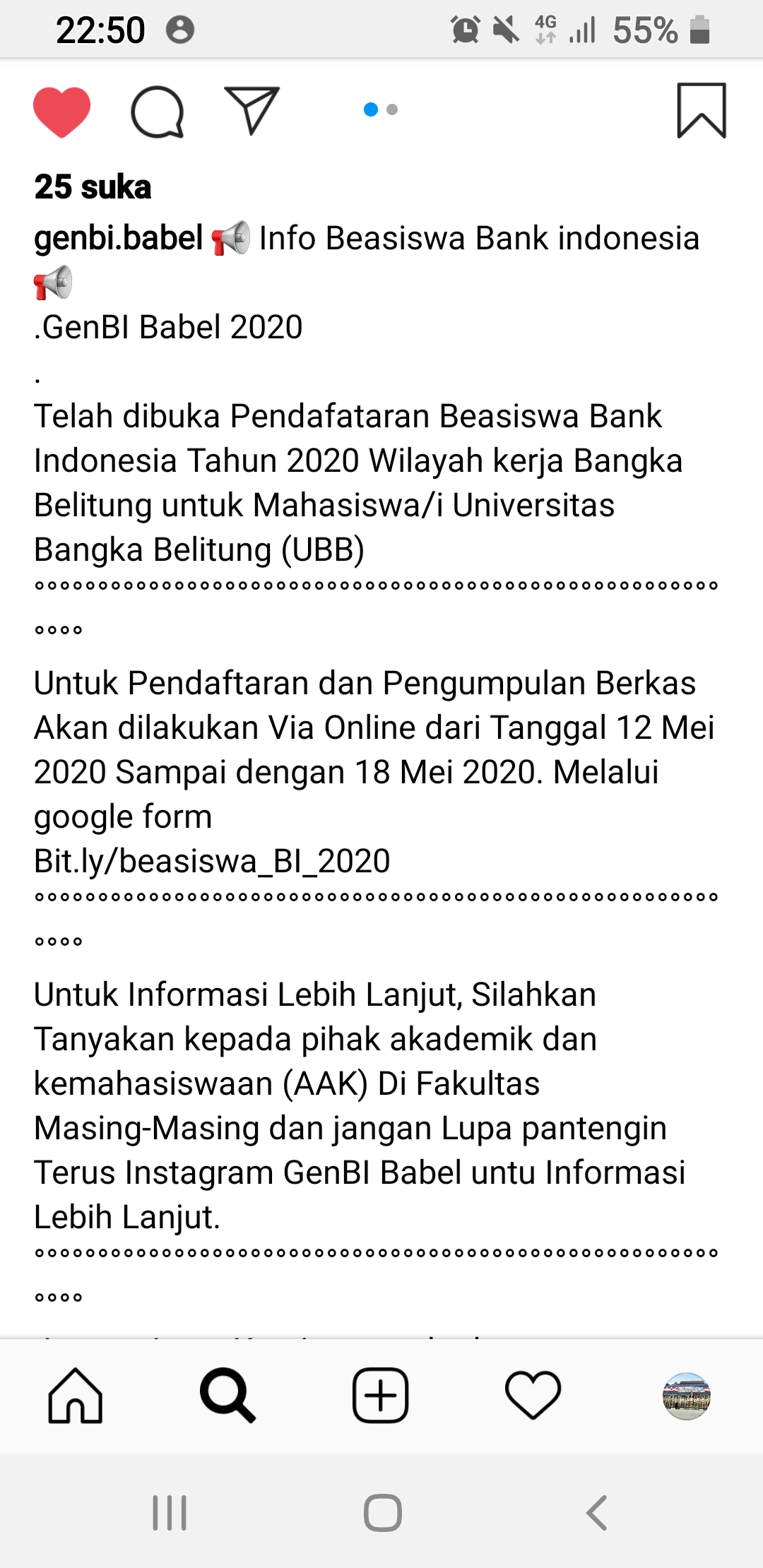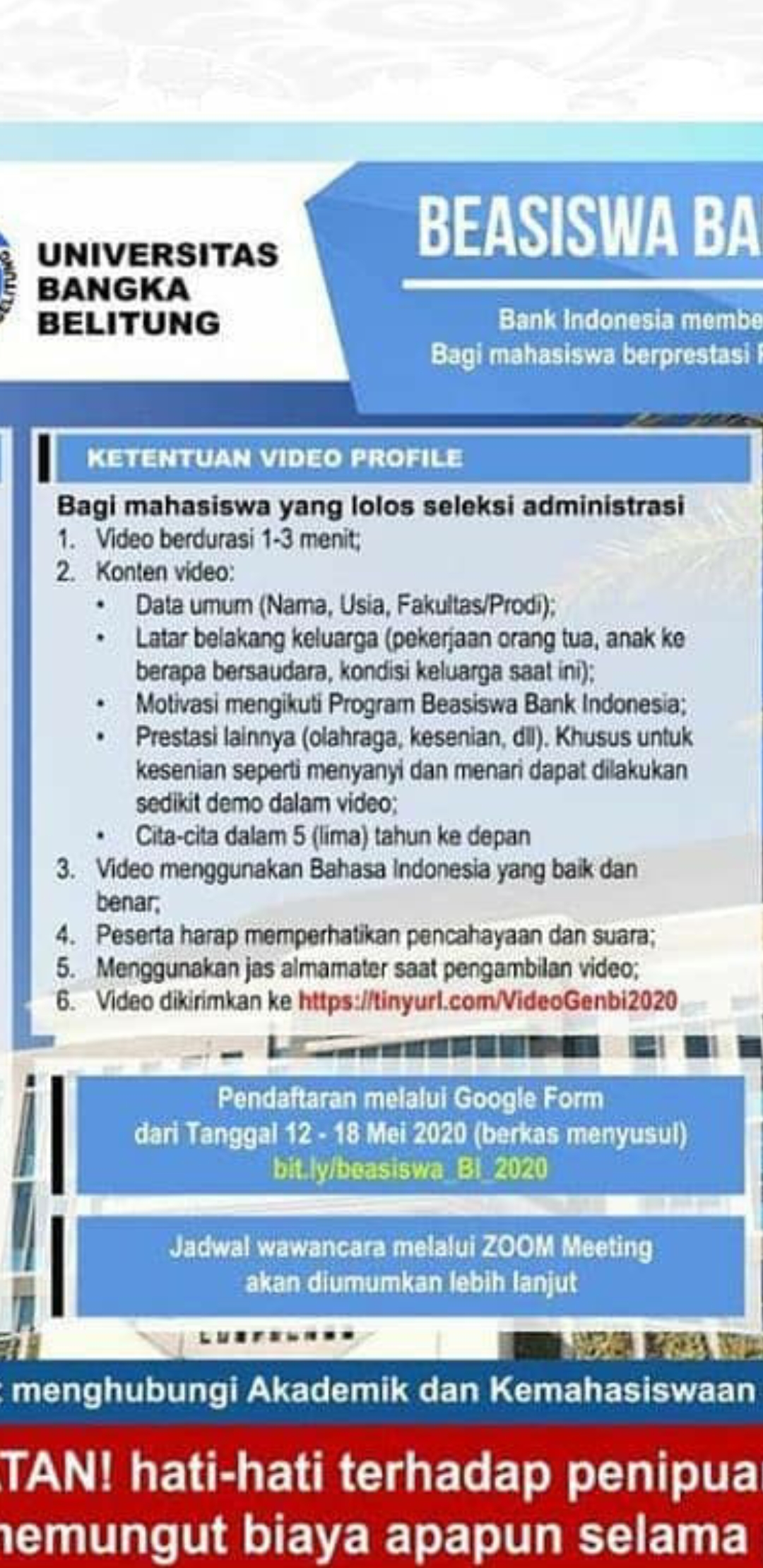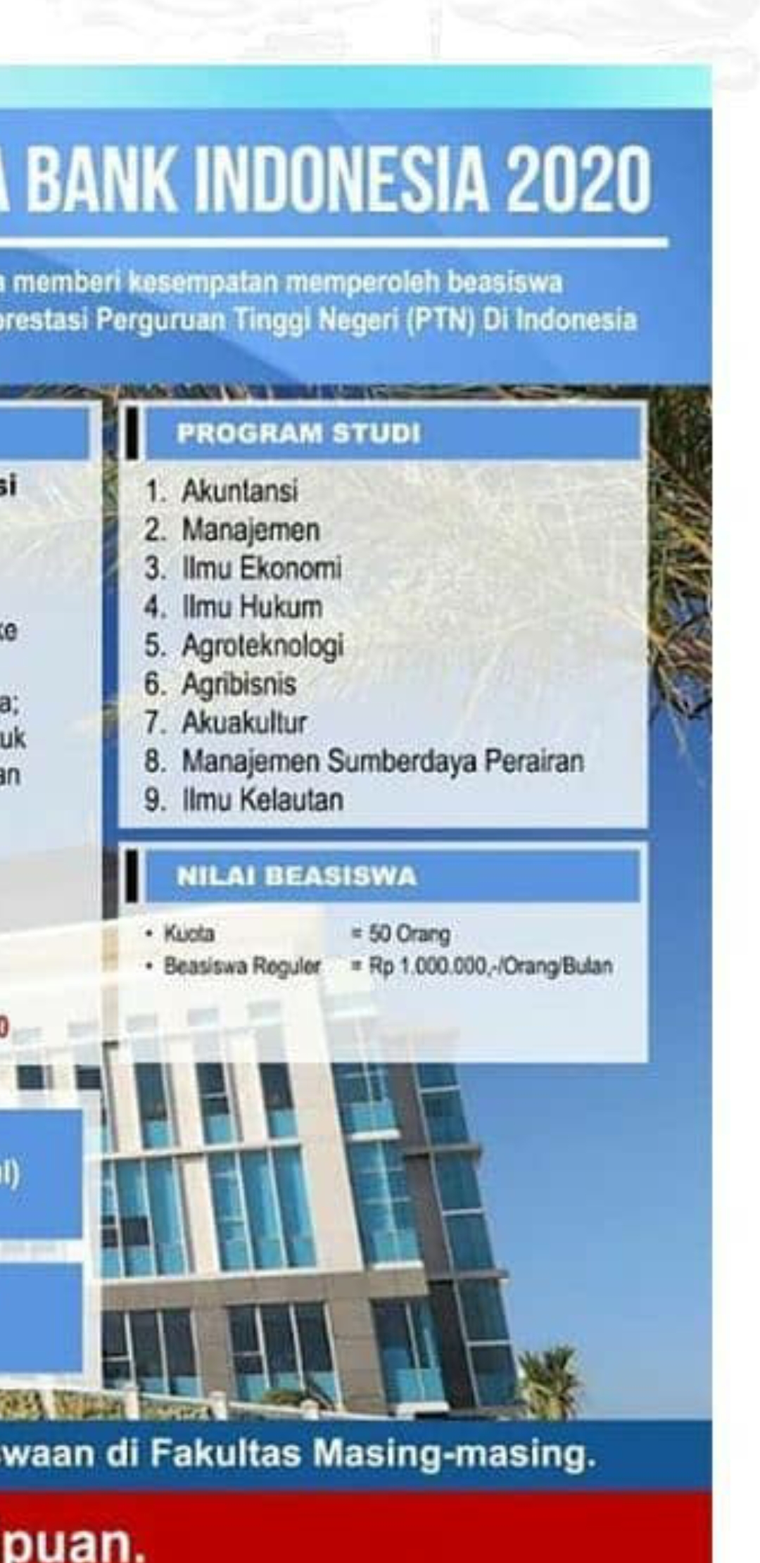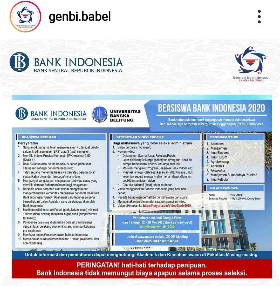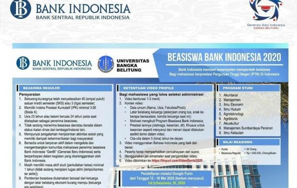 Telah dibuka Pendaftaran Beasiswa Bank Indonesia Tahun 2020 wilayah kerja Bangka Belitung untuk mahasiswa/i Universitas Bangka Belitung(UBB).