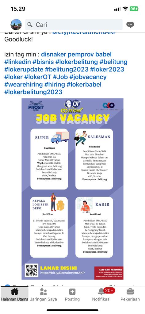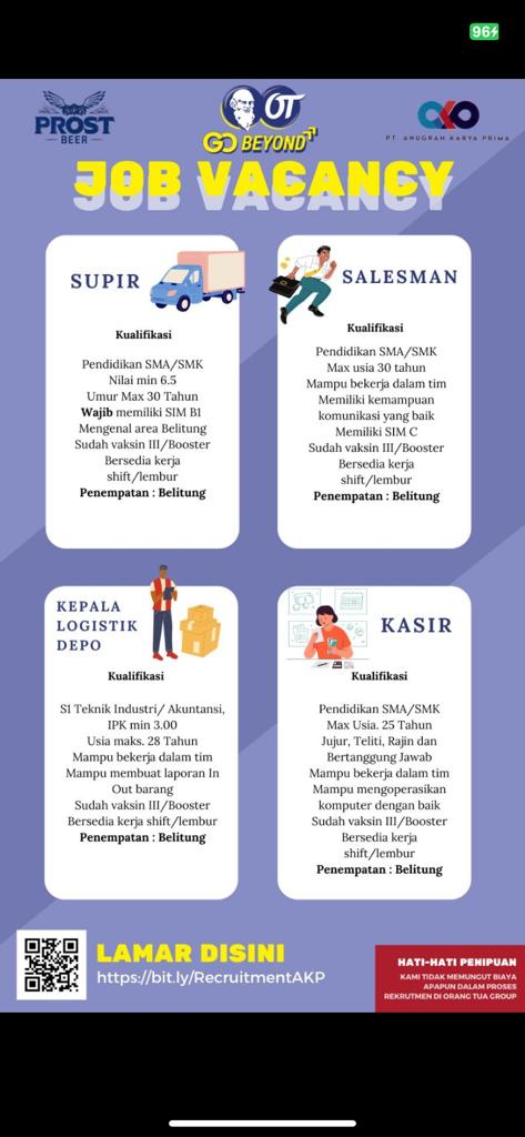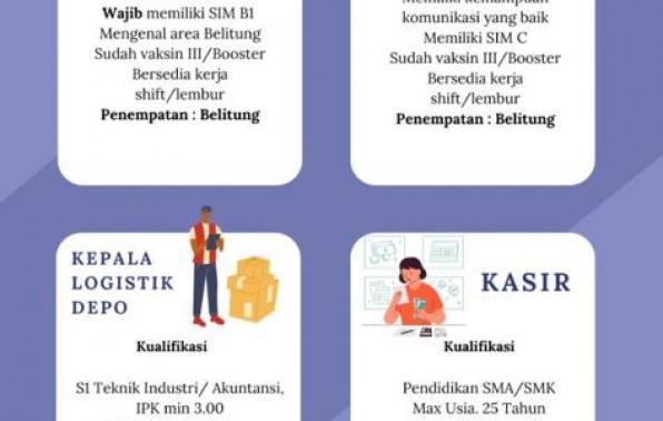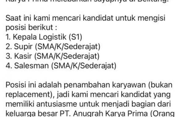 KASIR,KEPALA LOGISTIK DEPO,SALESMAN & SUPIR-PT ANUGRAH Karya Prima-Belitung