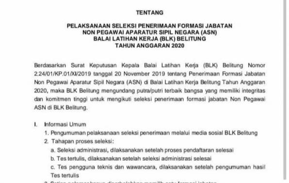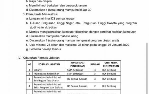 BLK Belitung membuka kesempatan kepada seluruh masyarakat yang memenuhi kualifikasi terlampir untuk mengikuti seleksi penerimaan Formasi Jabatan Non Pegawai Aparatur Sipil Negara (Sekuriti/Pramubakti Kebersihan/Pramubakti Administrasi) BLK Belitung Tahun Anggaran 2020.