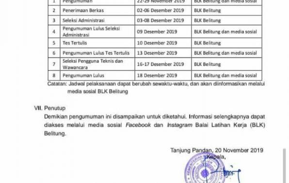 Segala informasi terkait proses pelaksanaan seleksi ini hanya akan diumumkan melalui Media Sosial (akun Facebook dan Instagram resmi BLK Belitung).