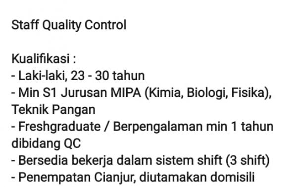 - Laki-laki, 23 - 30 tahun - Min S1 Jurusan MIPA (Kimia, Biologi, Fisika), Teknik Pangan - Freshgraduate / Berpengalaman min 1 tahun dibidang QC - Bersedia bekerja dalam sistem shift (3 shift) - Penempatan Cianjur, diutamakan domisili Cianjur, Sukabumi, Bandung & sekitarnya - Lokasi Tes : Cianjur
