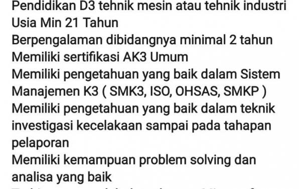 Pendidikan D3 tehnik mesin atau tehnik industri Usia Min 21 Tahun Berpengalaman dibidangnya minimal 2 tahun Memiliki sertifikasi AK3 Umum Memiliki pengetahuan yang baik dalam Sistem Manajemen K3 ( SMK3, ISO, OHSAS, SMKP ) Memiliki pengetahuan yang baik dalam teknik investigasi kecelakaan sampai pada tahapan pelaporan Memiliki kemampuan problem solving dan analisa yang baik Terbiasa mengolah data dengan Microsoft Office Mampu melakukan risk assesment activity, safety patrol, 5S dan Job safety Analisis. Mempunyai etos kerja yang tinggi, ulet, terampil, kreatif dan berwawasan luas.