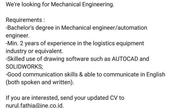 Hi, JNE is hiring! We're looking for Mechanical Engineering. Requirements :