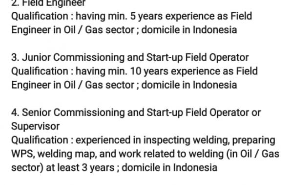 4. Senior Commissioning and Start-up Field Operator or Supervisor Qualification : experienced in inspecting welding, preparing WPS, welding map, and work related to welding (in Oil / Gas sector) at least 3 years ; domicile in Indonesia