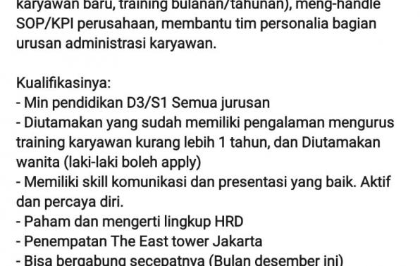 - Diutamakan yang sudah memiliki pengalaman mengurus training karyawan kurang lebih 1 tahun, dan Diutamakan wanita (laki-laki boleh apply)