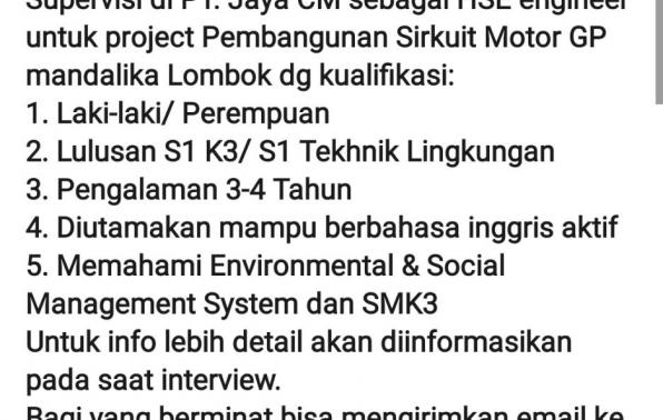 Dibutuhkan 1 kandidat sebagai Konsultan Supervisi di PT. Jaya CM sebagai HSE engineer untuk project Pembangunan Sirkuit Motor GP mandalika Lombok dg kualifikasi: