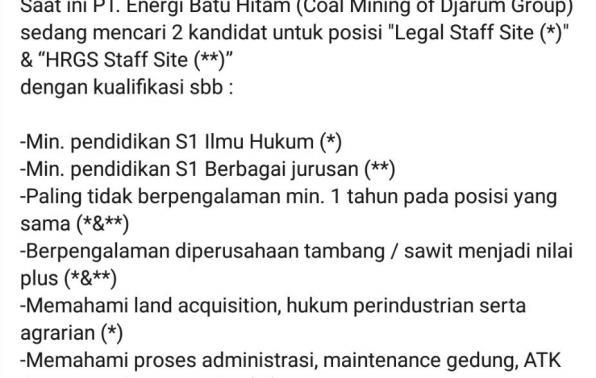 "Legal Staff Site & HRGS Staff Site” Saat ini PT. Energi Batu Hitam (Coal Mining of Djarum Group) sedang mencari 2 kandidat untuk posisi "Legal Staff Site (*)" & “HRGS Staff Site (**)”