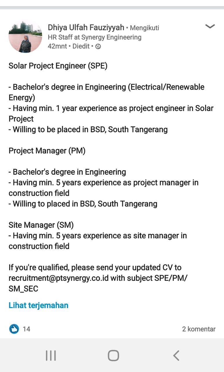 1.Solar Project Engineer (SPE) - Bachelor's degree in Engineering (Electrical/Renewable Energy) - Having min. 1 year experience as project engineer in Solar Project - Willing to be placed in BSD, South Tangerang