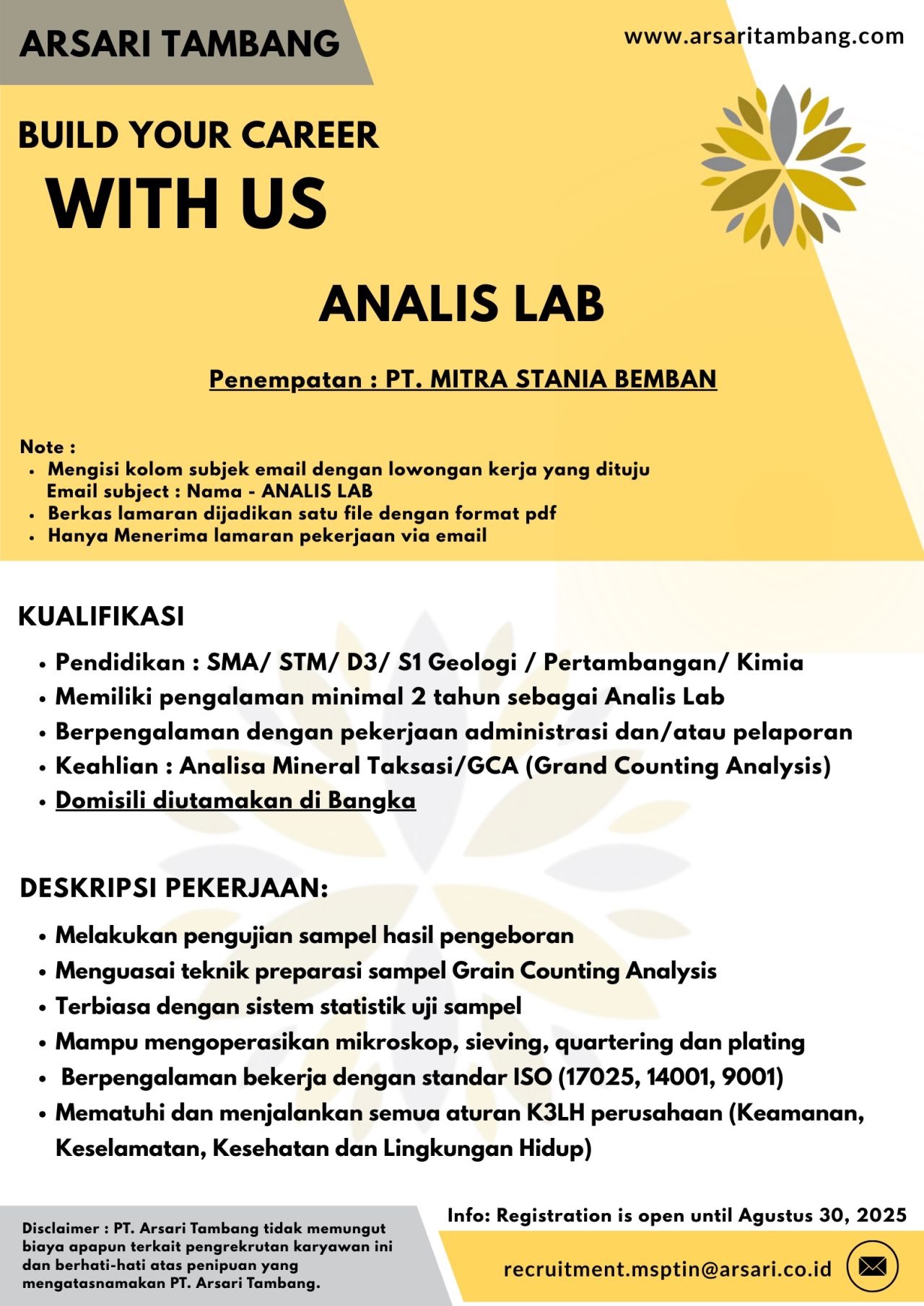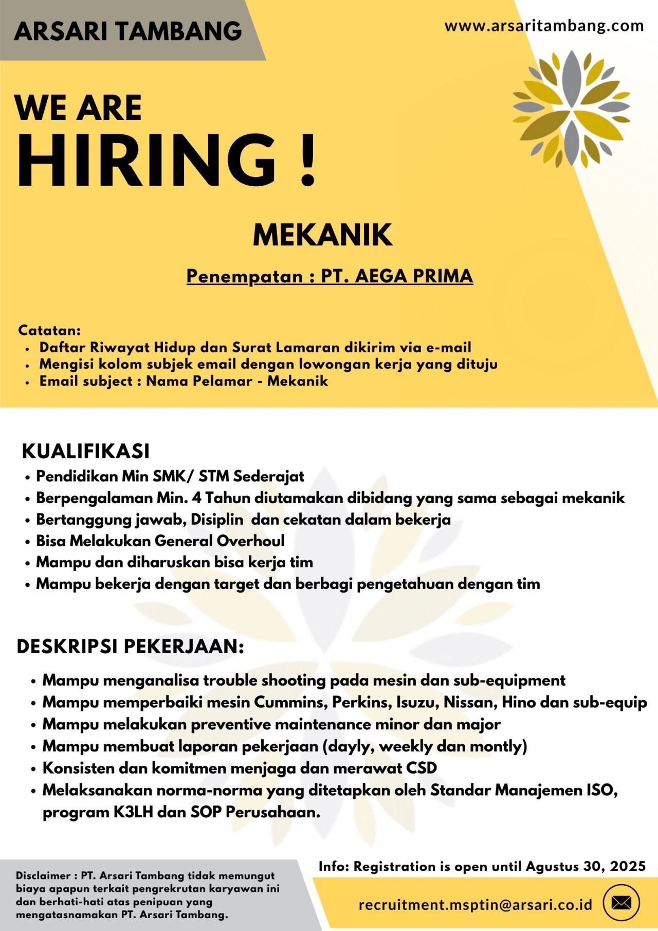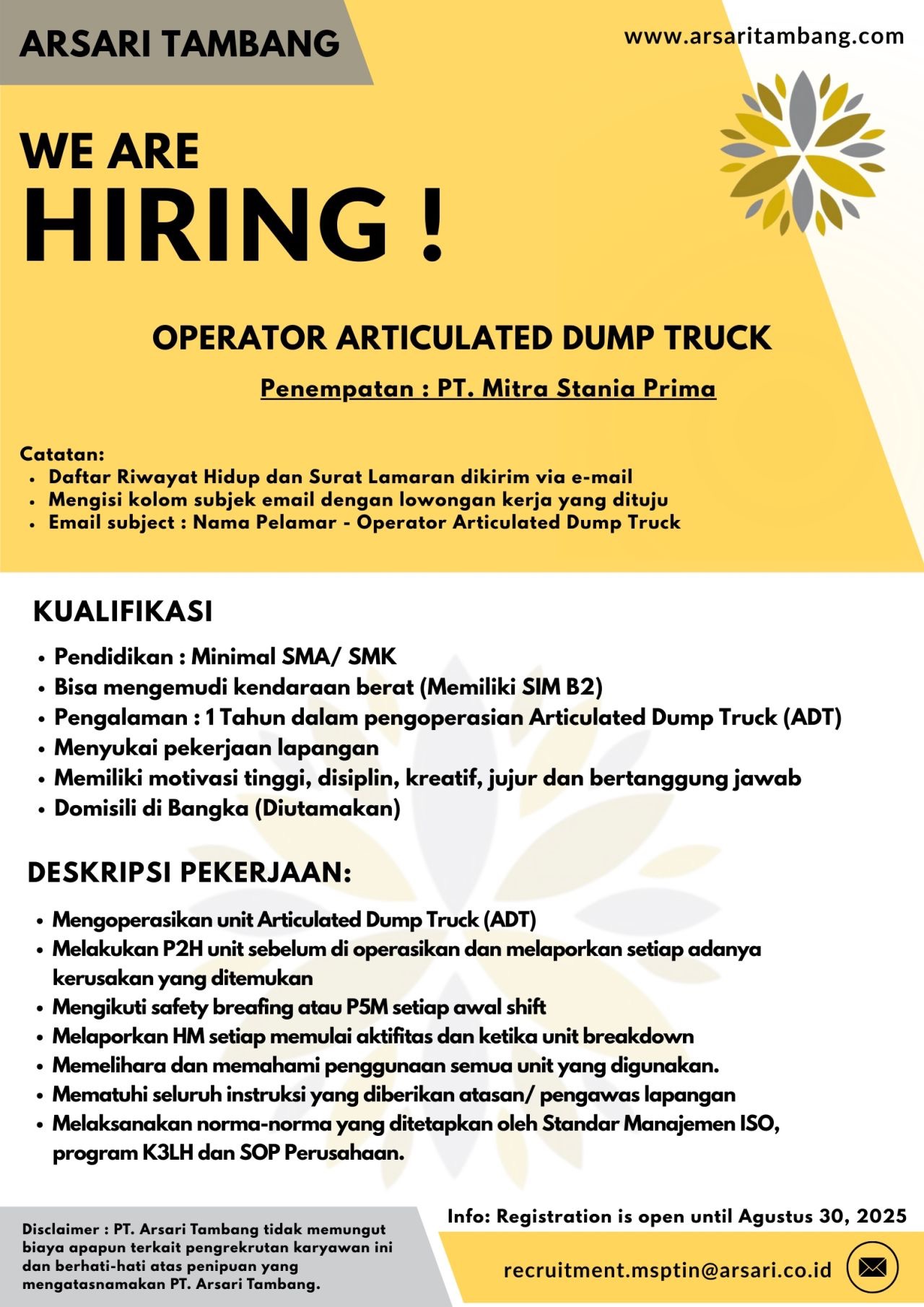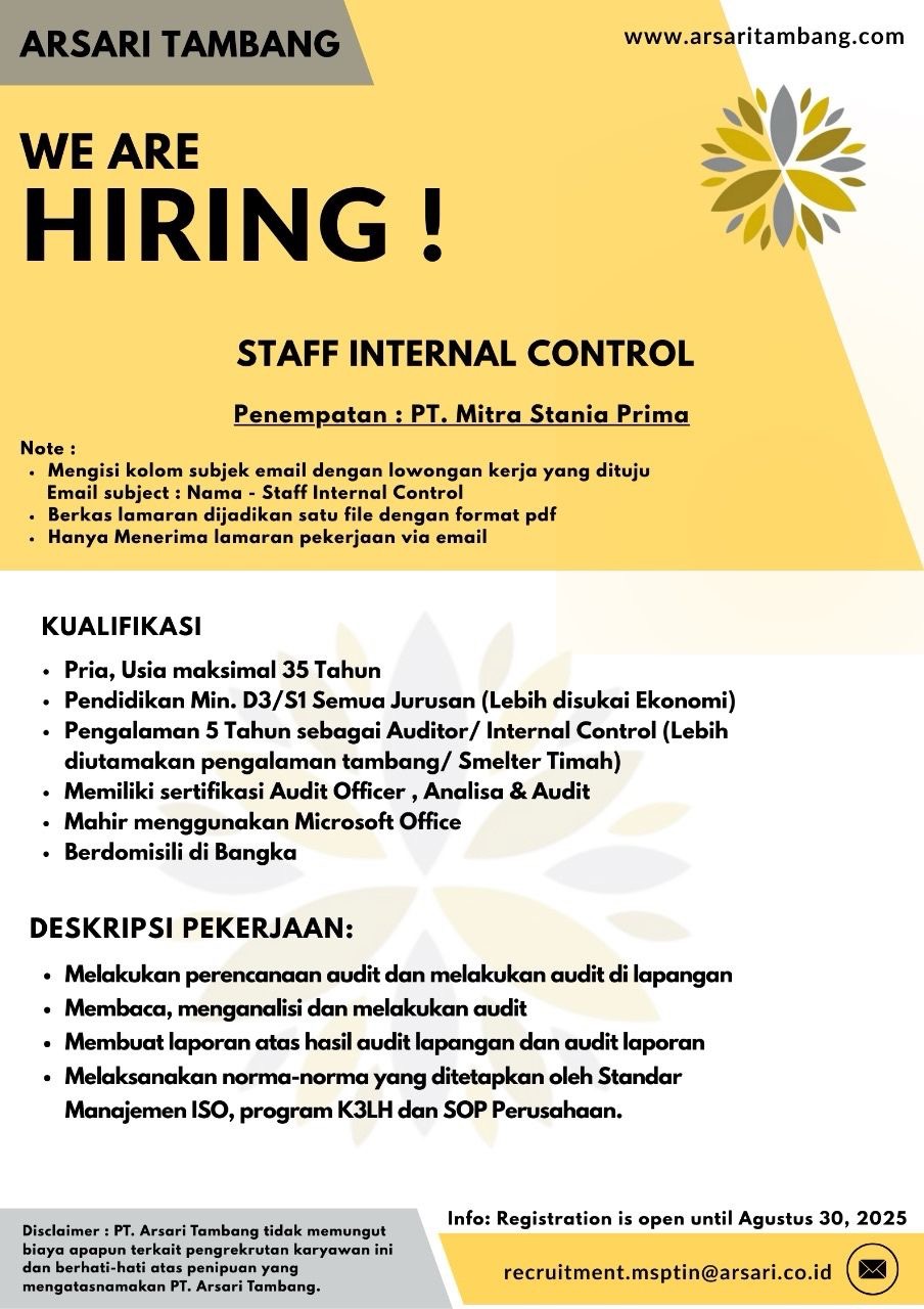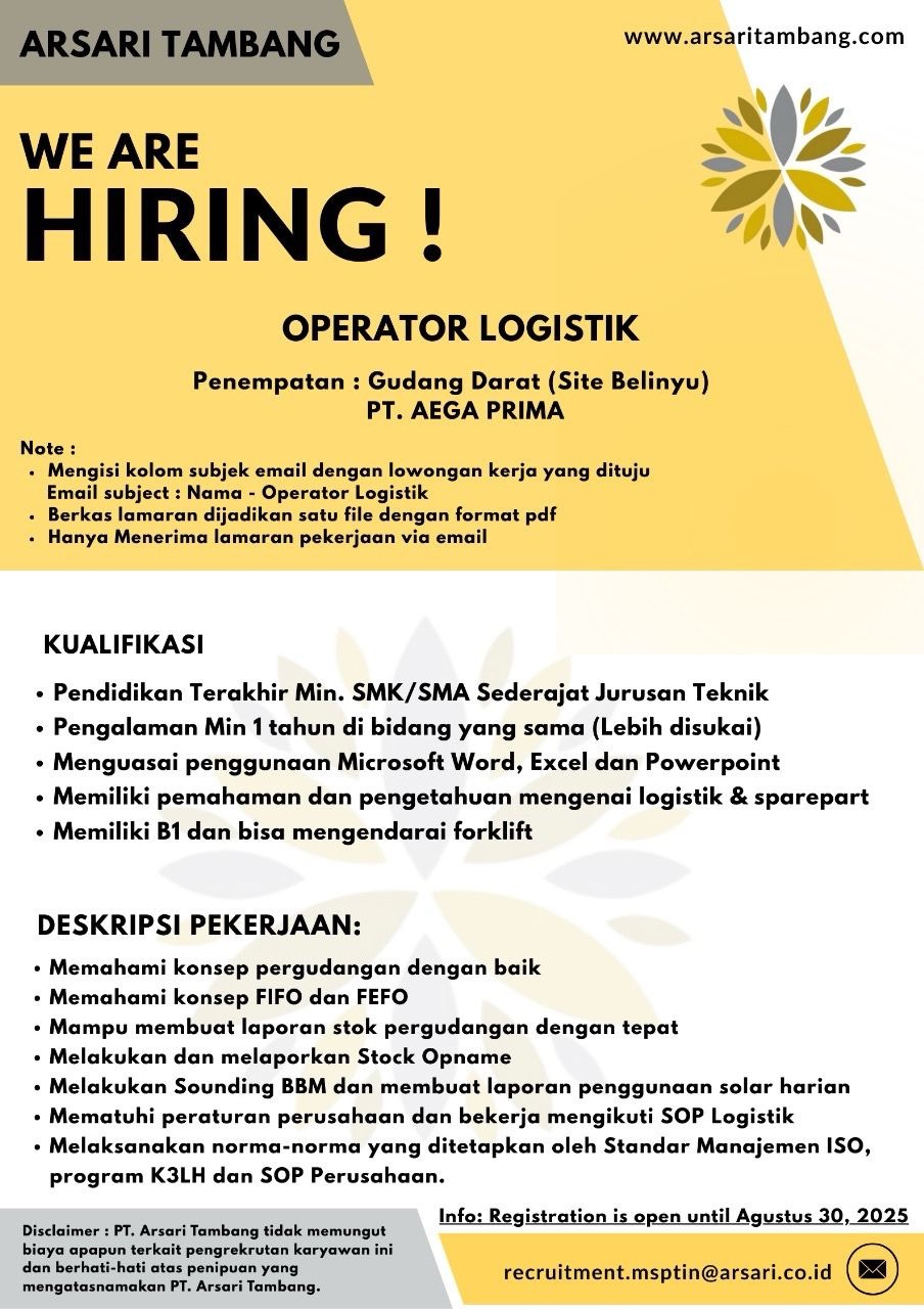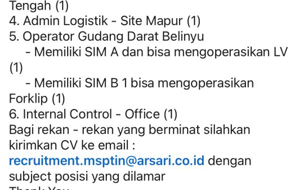 ARSARI GROUP Tambang membuka kesempatan kerja untuk posisi: