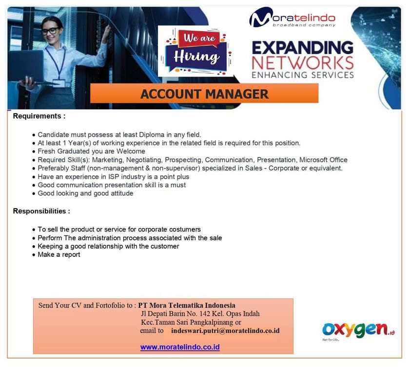 PT Mora Telematika Indonesia(expanding networks) membuka kesempatan kerja untuk posisi ACCOUNT MANAGER(oxygent)-Pangkalpinang