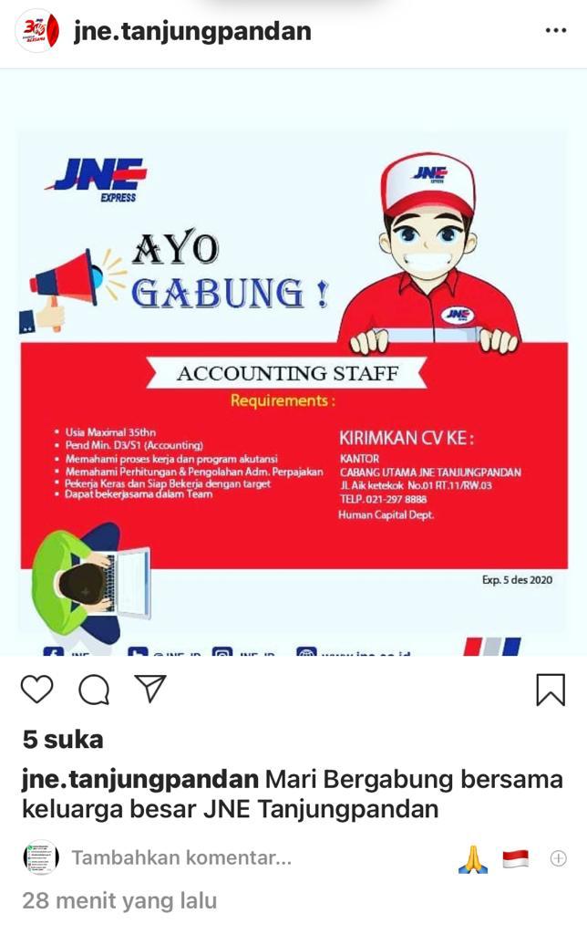 info Loker ACCOUNTING STAFF-JNE @Tanjungpandan