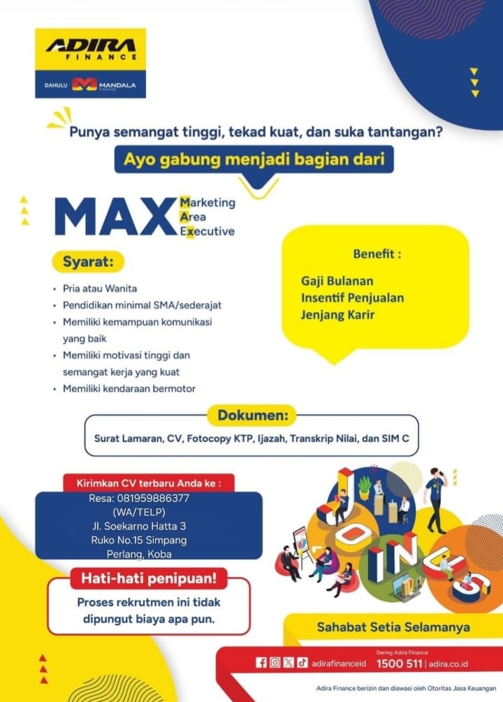untuk posisi MARKETING AREA EXECUTIVE, penempatan Bangka Tengah(Koba).