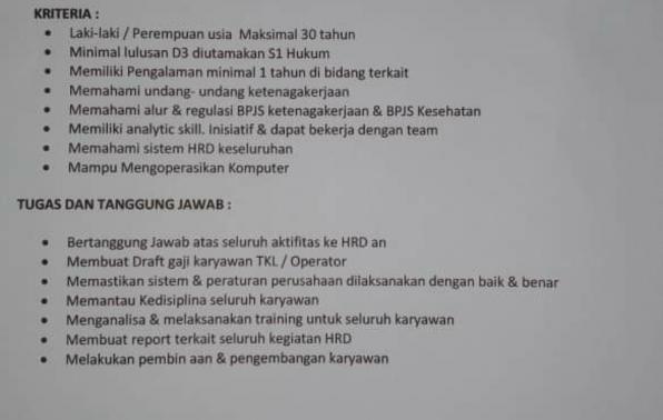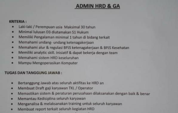 info Loker ADMIN HRD dan GA @PT.Bangka bintang Lestari-Pangkalpinang