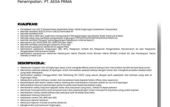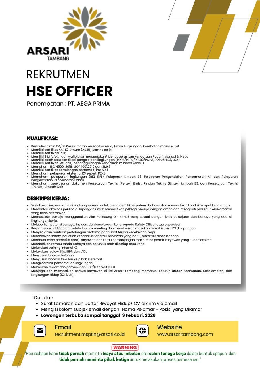 2. HSE OFFICER, penempatan PT AEGA PRIMA, batas akhir berkas 09 Februari 2026