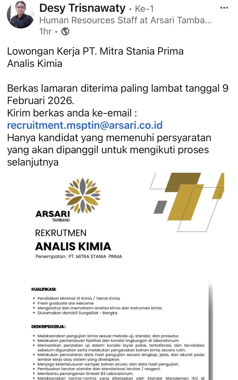 3. Analis KIMIA,penempatan PT MITRA STANIA PRIMA, batas akhir 09 Februari 2026