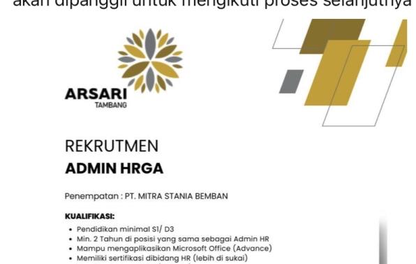 1. Admin HRGA,penempatan PT MItra Stania Bemban, batas akhir berkas 09 Februari 2026