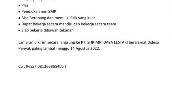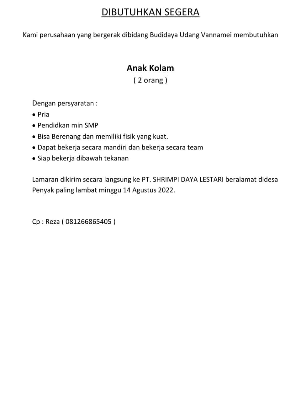 info Loker Anak Kolam-PT SHRIMPI DAYA LESTARI-BANGKA TENGAH-PENYAK