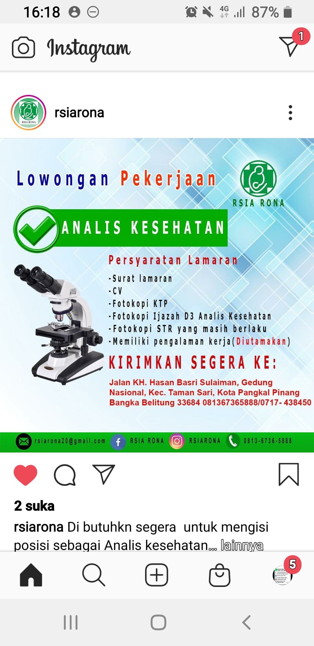 persyaratan: CV, surat Lamaran, fotokopi KTP, fotokopi /ijasah D3 analis Kesehatan, fotokopi STR yang masih berlaku, memiliki pengalaman kerja diutamakan.