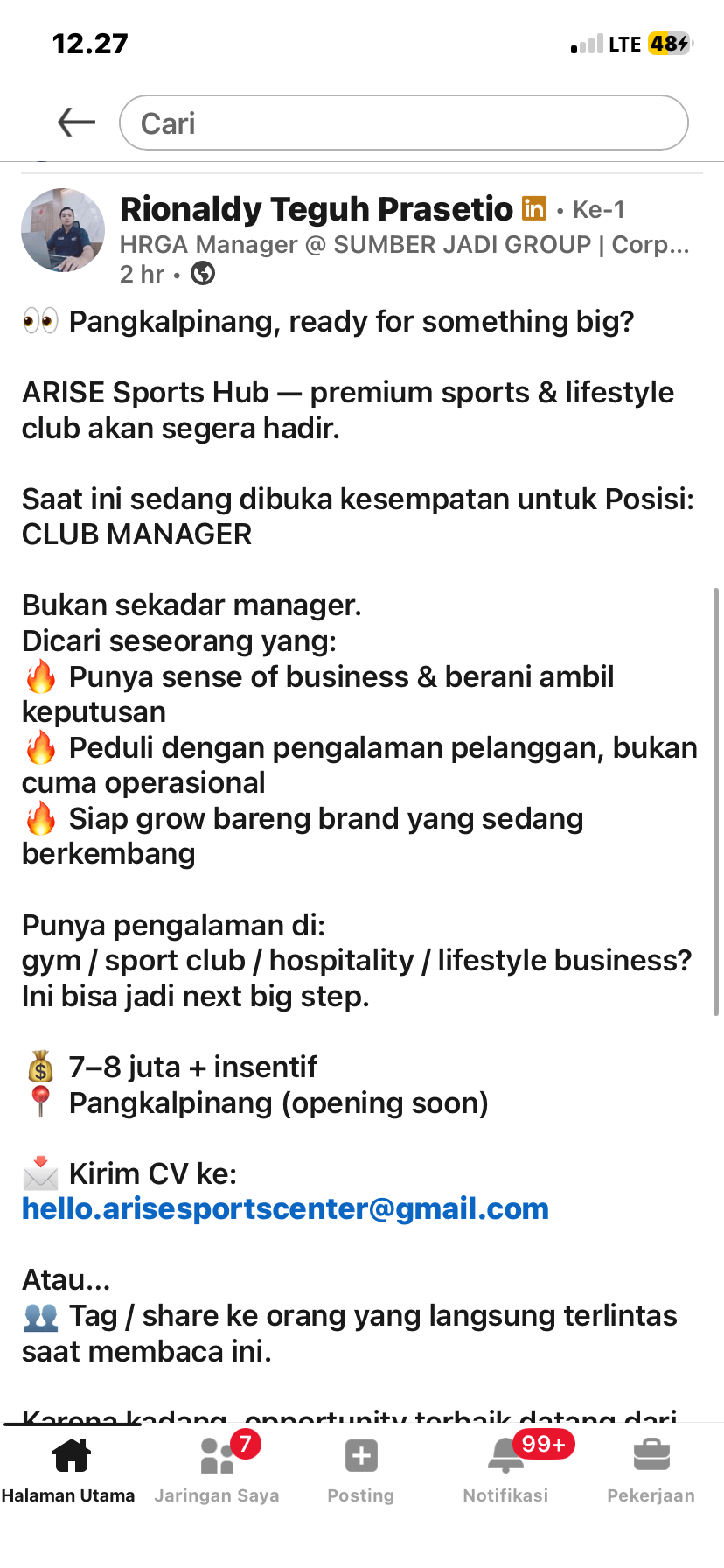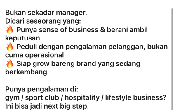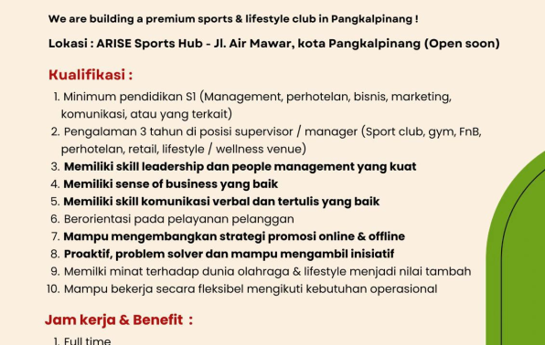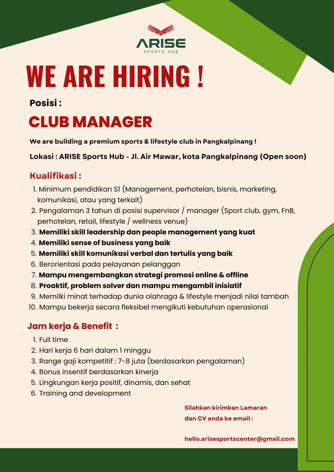 Bergerak di Fasilitas Olahraga membuka kesempatan kerja untuk posisi CLUB MANAGER.
