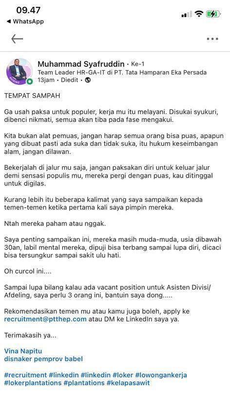 info Loker ASISTANT DIVISI/AFDELING @PT THEP-Bangka