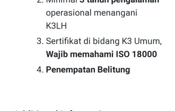 Dibutuhkan segera Asisten Safety Health Environment (K3LH) untuk penempatan Belitung: