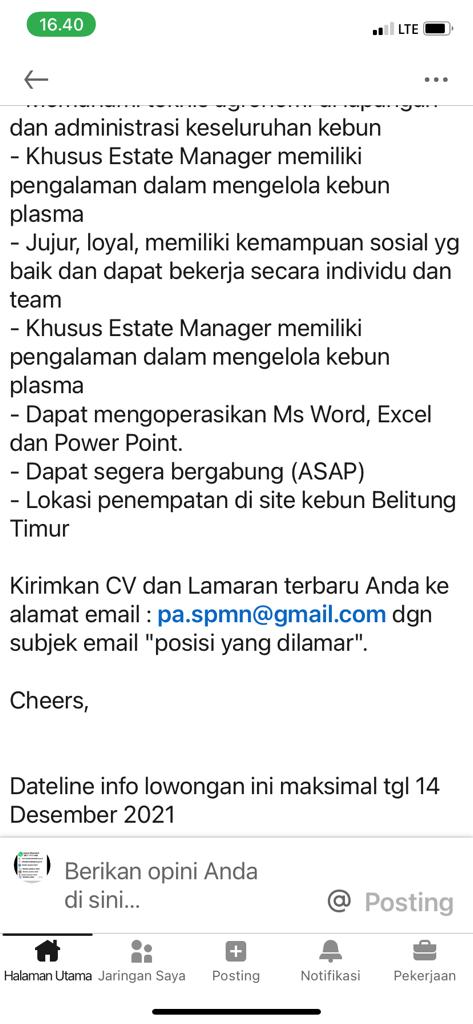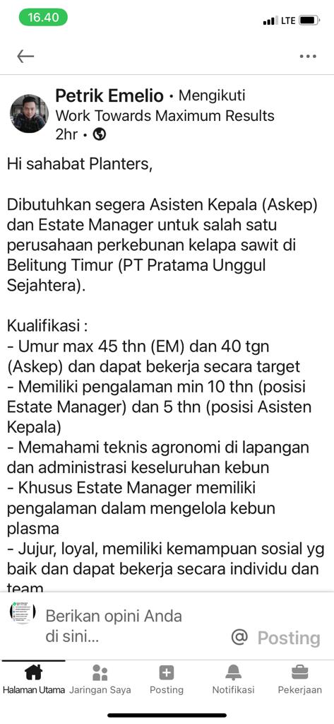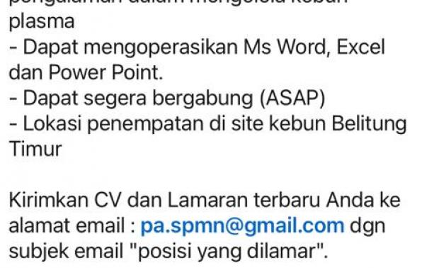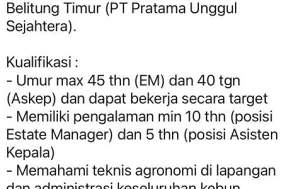 ASISTEN KEPALA/AsKep dan ESTATE MANAGER-PT Pratama Unggul Sejahtera-Belitung Timur