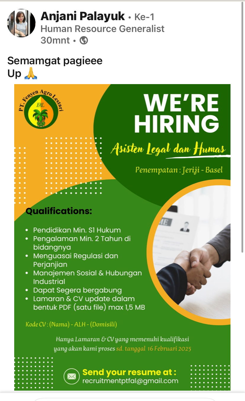 info Loker Asisten Legal& Humas-PT Fenyen Agro Lestari