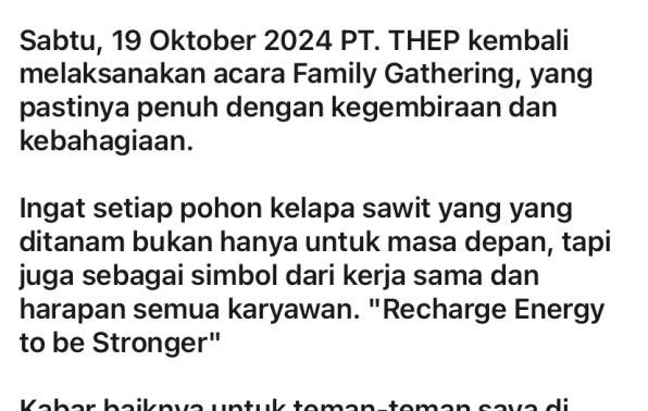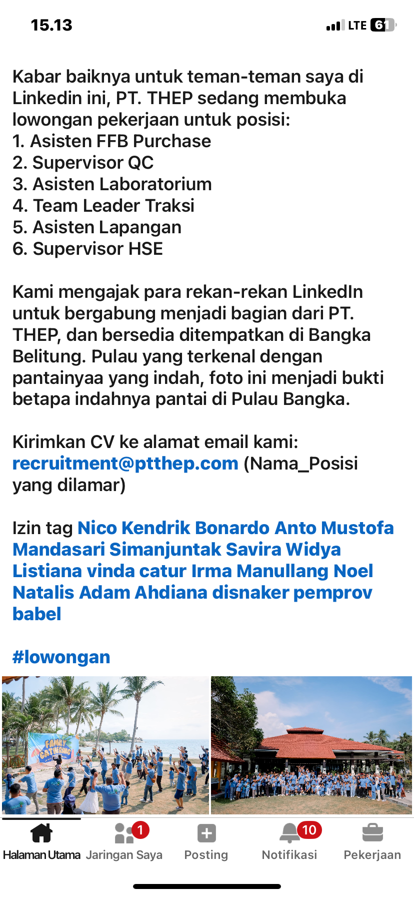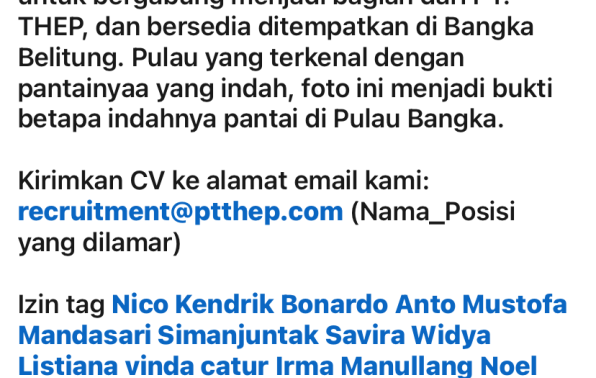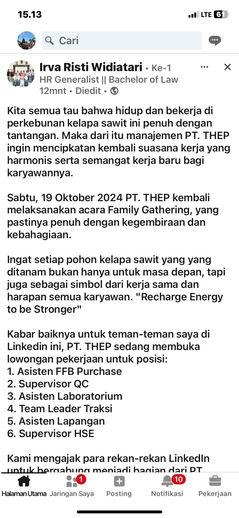 PT THEP, Perusahaan bergerak di bidang perkebunan kelapa wawit membuka kesempatan kerja untuk posisi:
