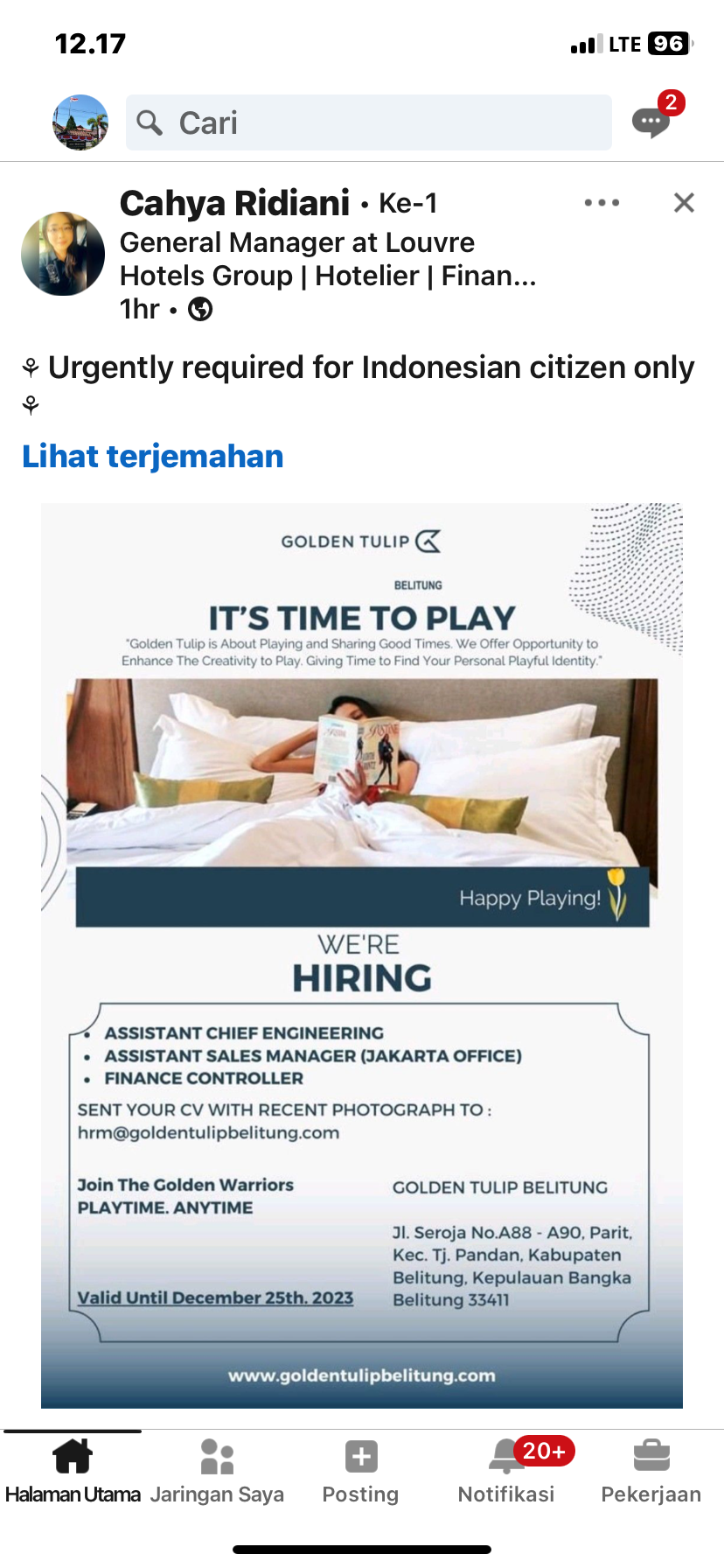 Golden Tulip Belitung membuka kesempatan untuk posisi: ASSISTANT CHIEF ENGINEERING & FINANCE CONTOLLER penempatan Belitung