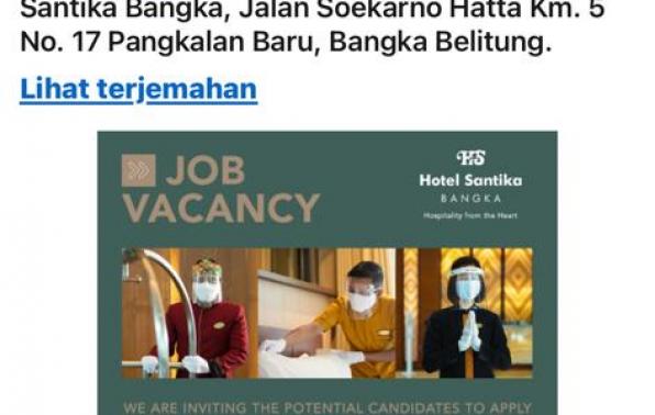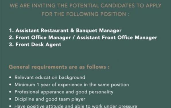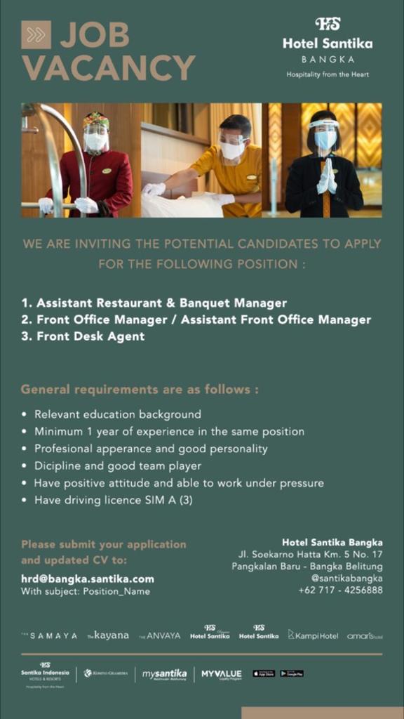Asst Restaurant & Banquet Manager,Front Office Manager/Asst Front Office Manager,Front Desk Agent-Hotel Santika-Bangka