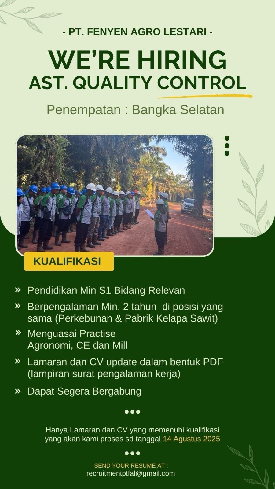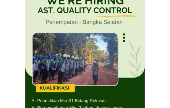 - Ast Quality Control penempatan Bangka Selatan, Batas kirim Berkas Lamaran hingga 14/08/2025.