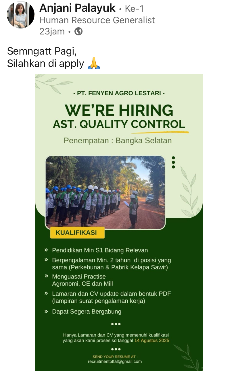 PT Fenyen Agro Lestari membuka kesempatan kerja untuk posisi: