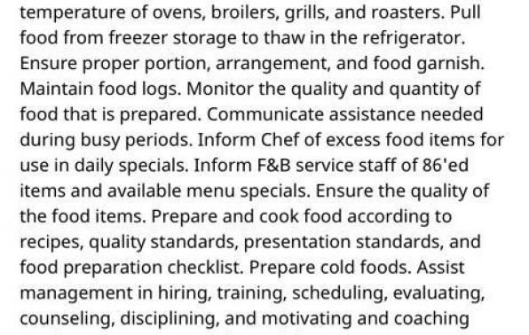 Prepare special meals or substitute items. Regulate temperature of ovens, broilers, grills, and roasters. Pull food from freezer storage to thaw in the refrigerator. Ensure proper portion, arrangement, and food garnish. Maintain food logs. Monitor the quality and quantity of food that is prepared. Communicate assistance needed during busy periods. Inform Chef of excess food items for use in daily specials. Inform F&B service staff of 86'ed items and available menu specials. Ensure the quality of the food items. Prepare and cook food according to recipes, quality standards, presentation standards, and food preparation checklist. Prepare cold foods. Assist management in hiring, training, scheduling, evaluating, counseling, disciplining, and motivating and coaching employees; serve as a role model.