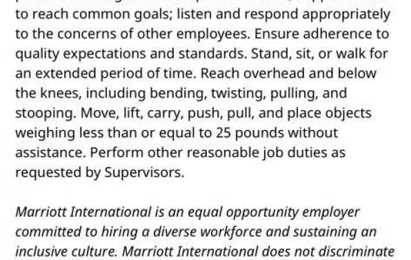 Follow all company and safety and security policies and procedures; report maintenance needs, accidents, injuries, and unsafe work conditions to manager; complete safety training and certifications. Ensure uniform and personal appearance are clean and professional; maintain confidentiality of proprietary information; protect company assets. Anticipate and address guests' service needs. Speak with others using clear and professional language. Develop and maintain positive working relationships with others; support team to reach common goals; listen and respond appropriately to the concerns of other employees. Ensure adherence to quality expectations and standards. Stand, sit, or walk for an extended period of time. Reach overhead and below the knees, including bending, twisting, pulling, and stooping. Move, lift, carry, push, pull, and place objects weighing less than or equal to 25 pounds without assistance. Perform other reasonable job duties as requested by Supervisors.
