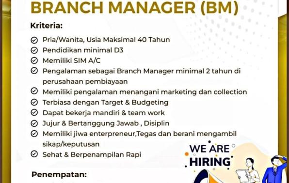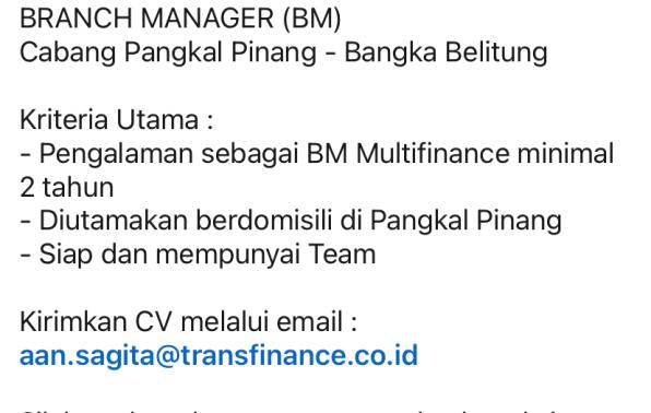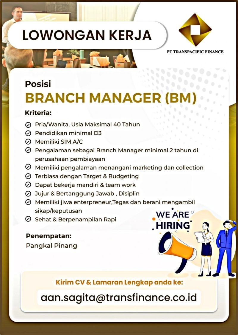 PT TRANSPACIFIC FINANCE membuka kesempatan kerja untuk posisi Branch Manager penempatan Pangkalpinang.