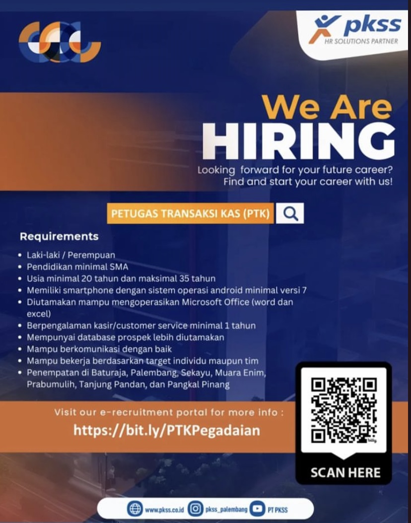 - Petugas Transaksi Kas/PTK (penempatan di Tanjungpandan & Pangkalpinang)