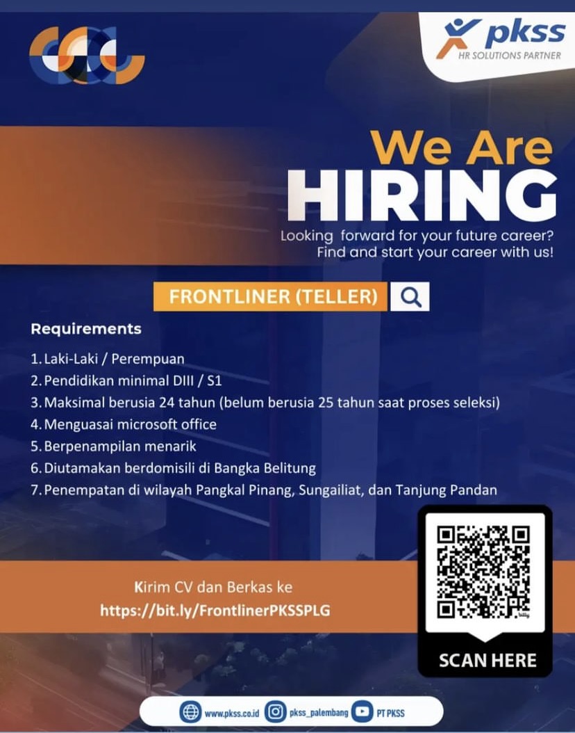 - Frontliner/Teller (Lokasi penempatan Pangkalpinang,Sungailiat & TanjungPandan)