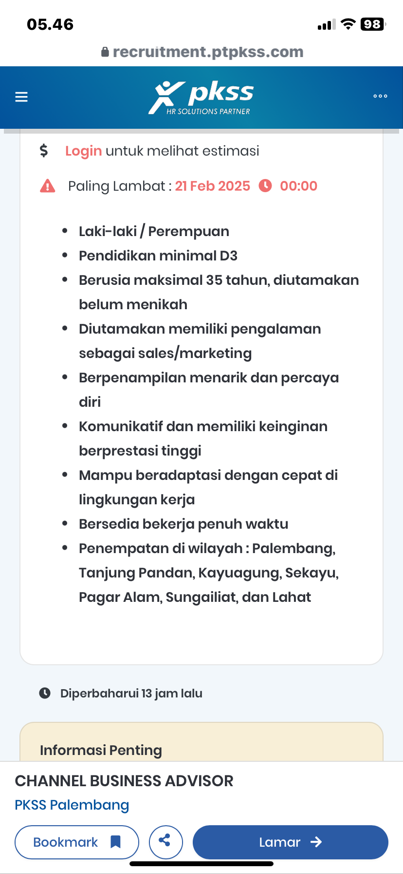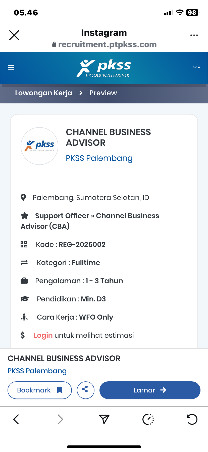 Link Pendaftaran: https://recruitment.ptpkss.com/id/co/pkss-palembang/reg-2025002-channel-business-advisor