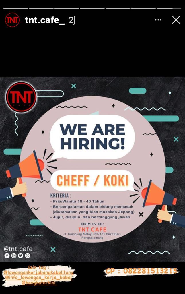 Kirim berkas Lamaran ke TNT CAFE: Jl.kampung Melayu No.181 , bukit Baru-pangkalpinang.