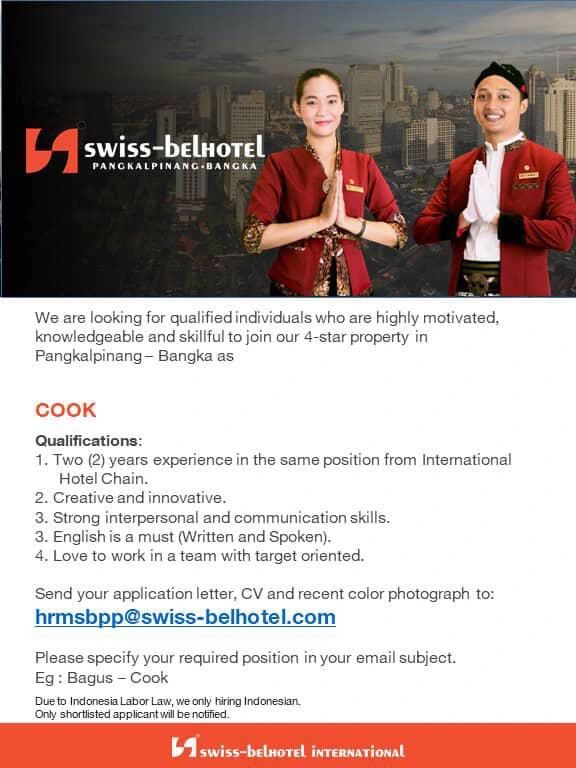 SWISS BEL HOTEL Pangkalpinang membuka kesempatan kerja untuk posisi COOK.